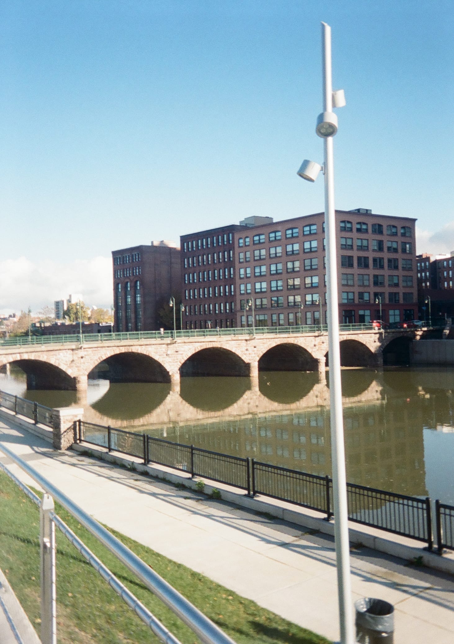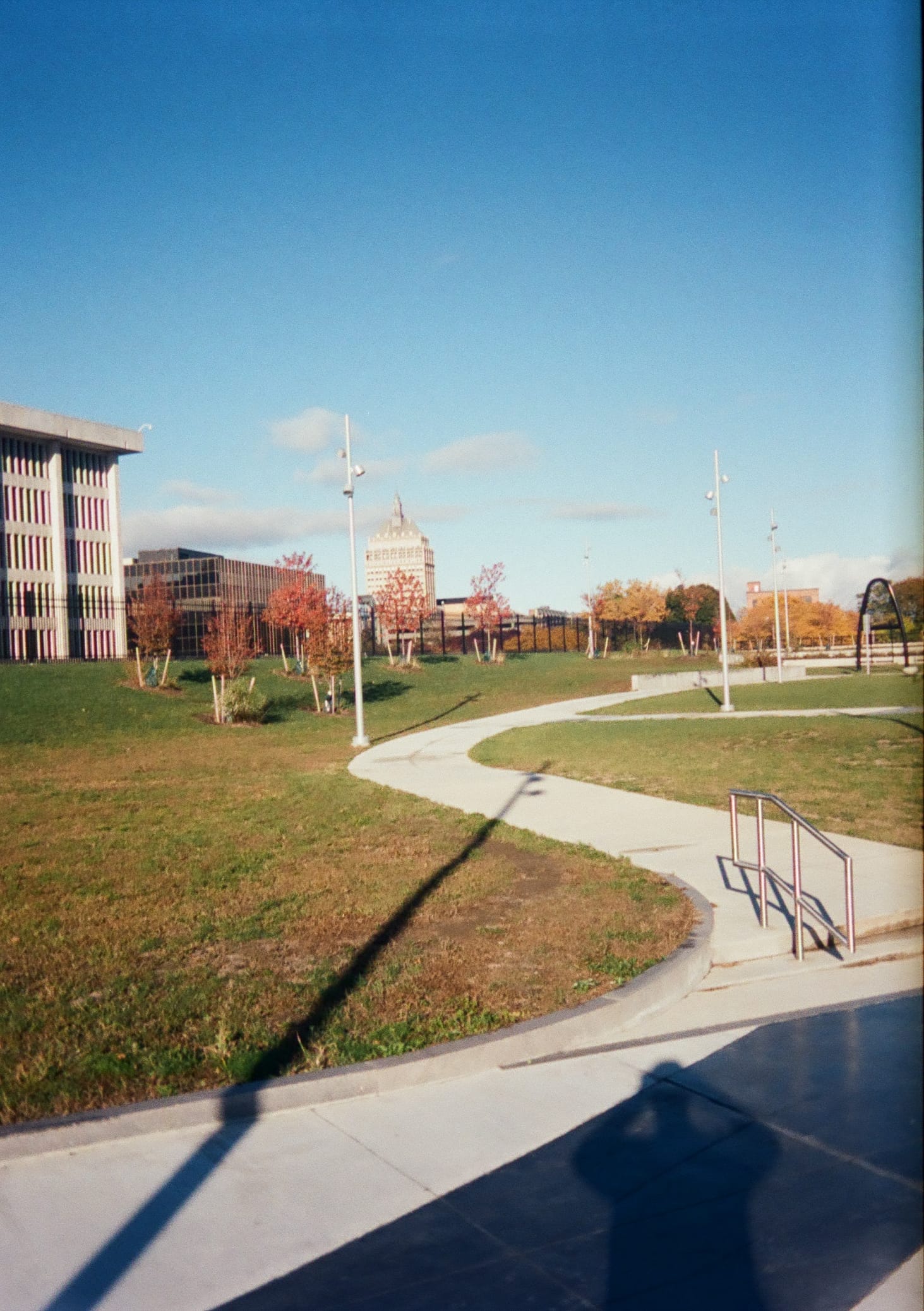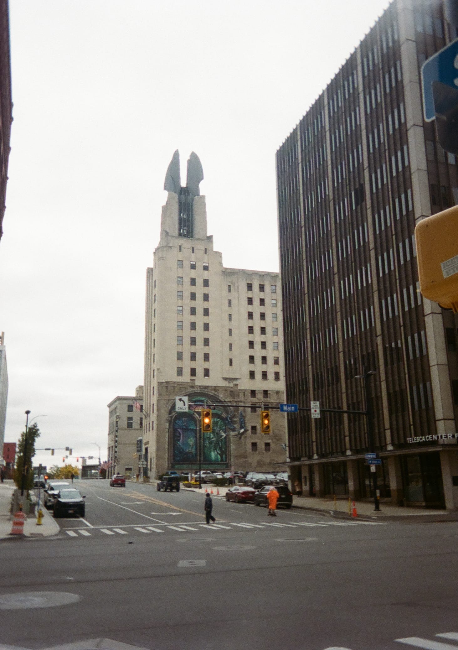 In Rochester I got to have a friend show me around the city, which is the historical home of the Kodak corporation, which still has the Kodak signage on a beautiful old building, though you can't make it out here because half-frame photos do not offer a lot of detail at distance: